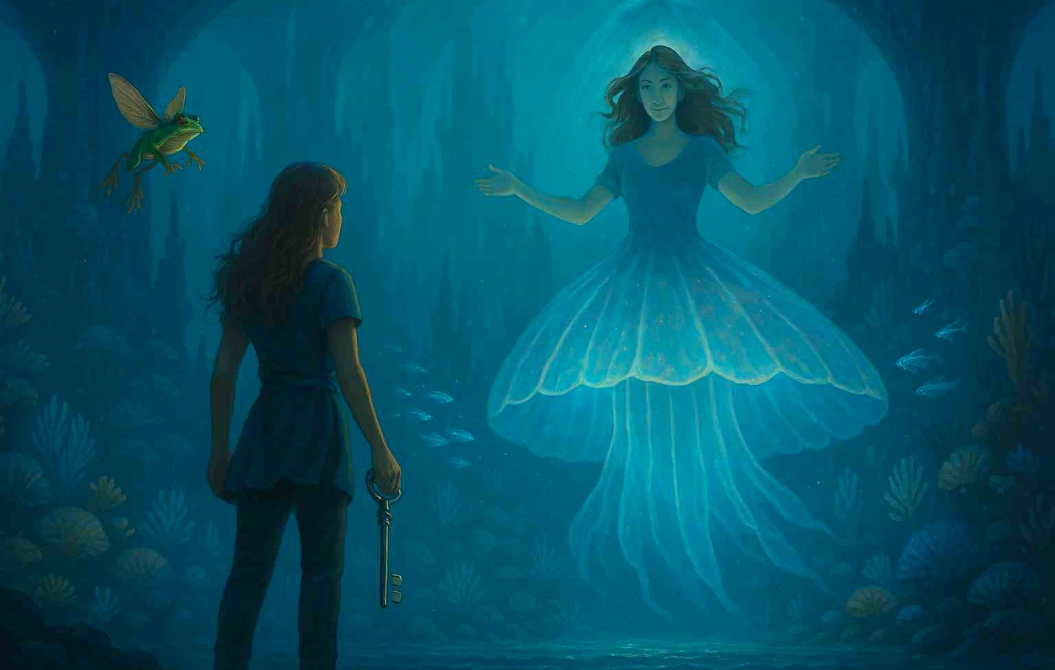 A gigantic jellyfish emerged, uncurling gracefully into a woman from the waist up. “Welcome home, Kalia.” She spoke melodically with a smile, showing pearl-bright teeth. Her jelly-skirt pulsed with divine elegance, mirroring her brown hair, floating with delicate grace. Kalia was captivated. This place felt like a familiar fairy tale. “We’ve been waiting for you,” the jelly girl added, stretching her arms.
